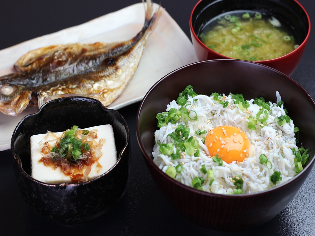 湯河原温泉で人気の十二庵さんの絹ごし豆腐を冷奴でご用意。湯河原かまとらさんの鯵の干物としらす丼とお味噌汁。美味しいものだけの朝食となっております!!