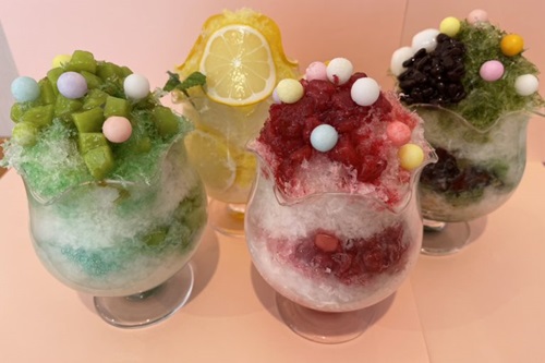 100年以上の歴史を持つ老舗酒店をリノベーションした空間に、抹茶あんみつや白玉クリームあんみつが品よく並びます。